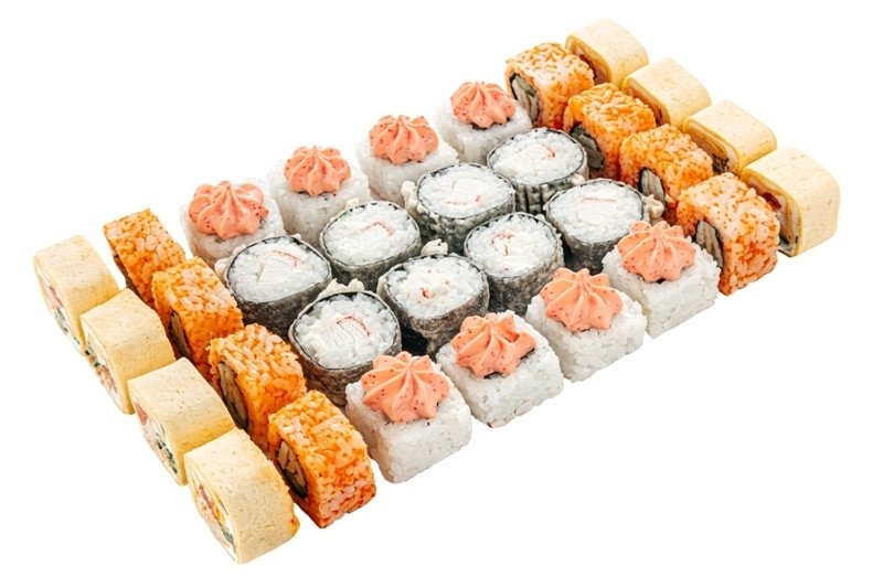 Лава - Японский рис,нори, лосось, сливочный сыр, украшается соусом Лава Тортилья Цыпленок - Сырная лепешка, сливочный сыр, курица хк, огурец свежий, помидор свежий, соус кимчи Окинава - Японский рис, нори, снежный краб (сурими), сыр Каппа масаго - Японский рис, нори японский омлет, свежий огурец, икра масаго Имбирь/васаби/соевый - по 1